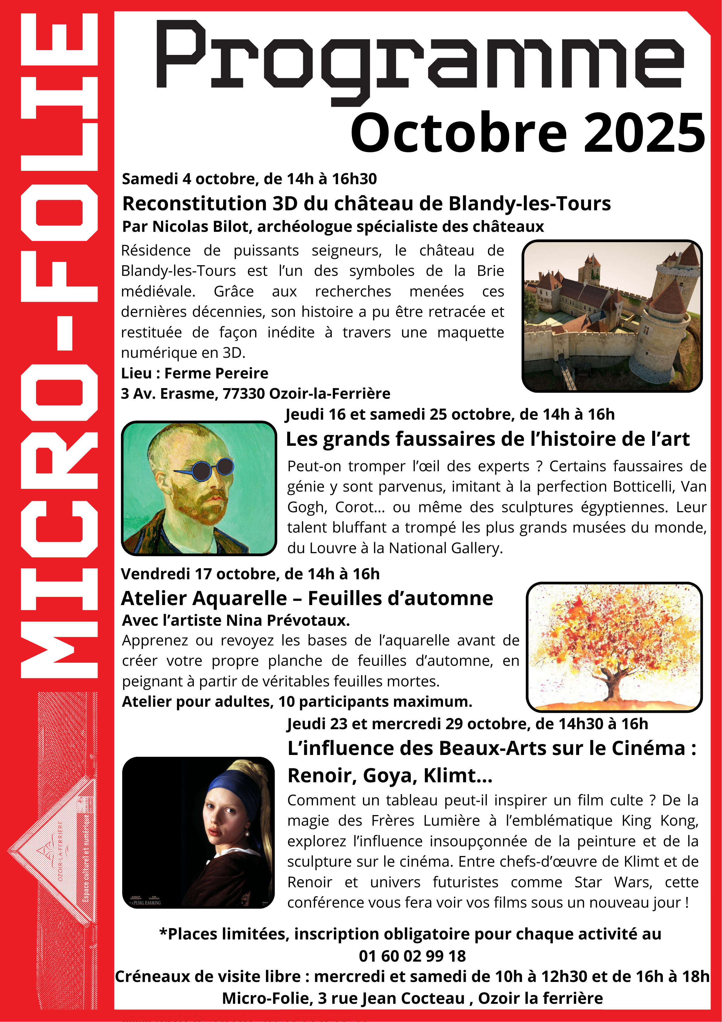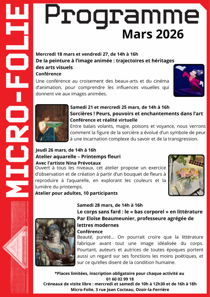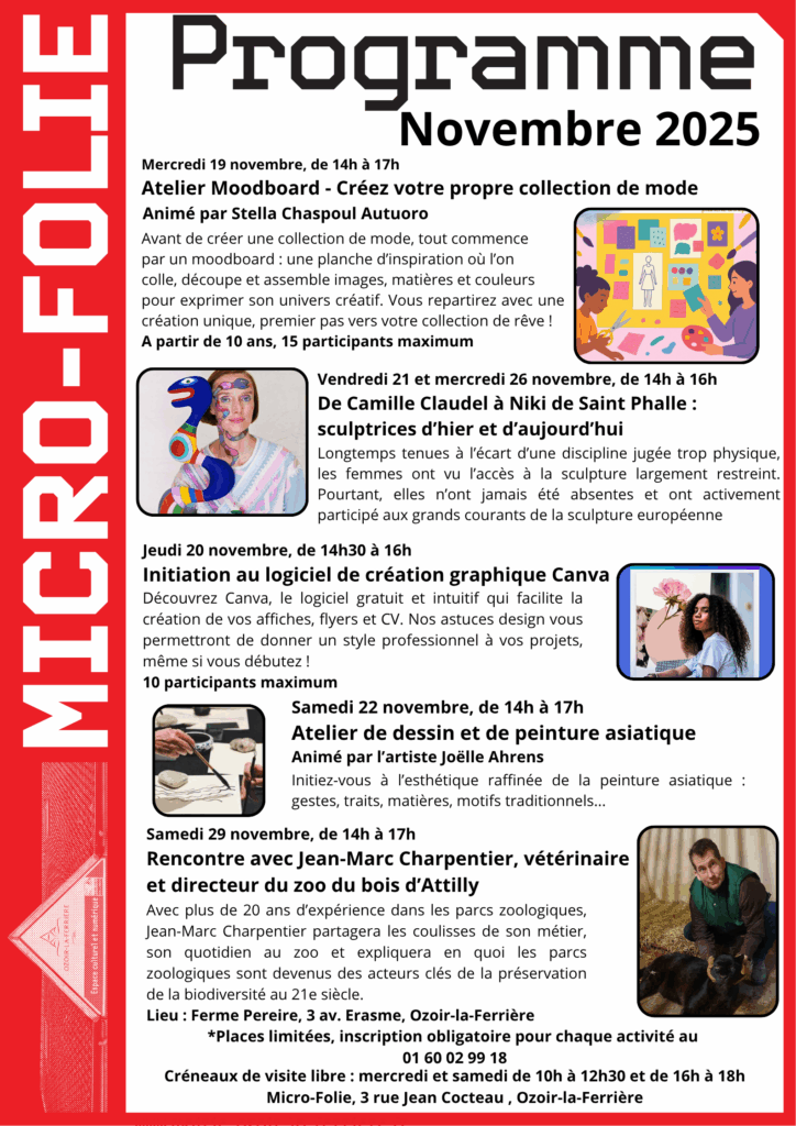 – Conférences et ateliers gratuits, sur réservation par téléphone au 01 60 02 99 18.